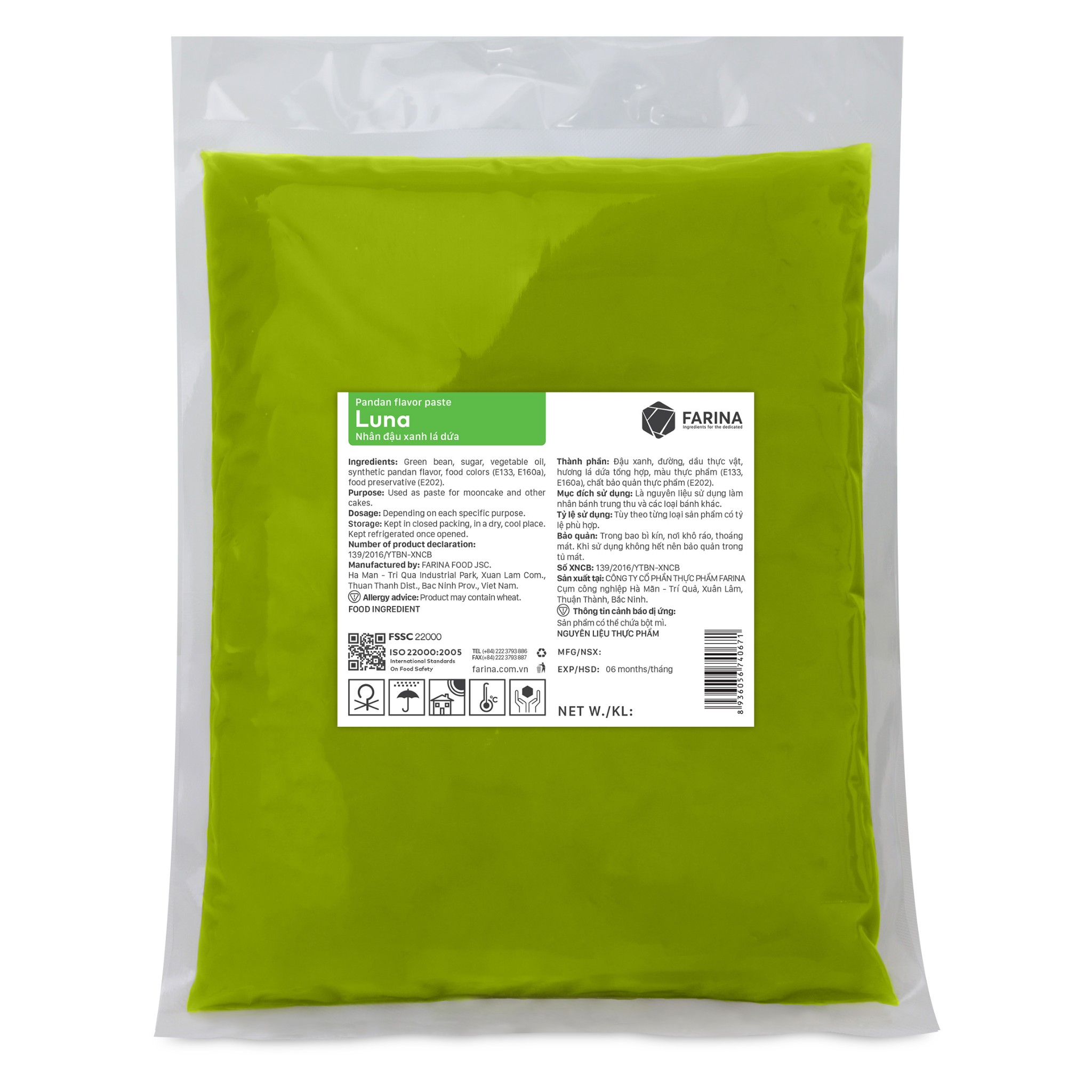 Thành phầnĐậu xanh, đường, dầu thực vật, hương, màu thực phẩm, chất bảo quản E202